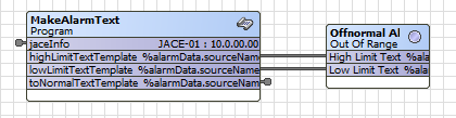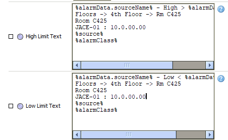 So, I figured out a work around for anyone who might come across this in the future wanting to make dynamic text in their alarms. I created a new slot in the Config of my JACE with the station name and IP address (you could create a string writable somewhere in the JACE as well), and linked that to a program block (from the program palette) which can use the text from the slot. You can then concatenate messages with all the information you need for the alarm texts and set those to output slots on the program. Then you link those output slots to the slots on the alarm for toOffnoram, toNormal, High Limit, and Low Limit texts, where it will populate those text boxes. The code for the program block is below. It doesn’t need any imported libraries other than the default ones. In theory, with this method you could add anything to your alarm text.