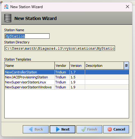 For the purpose of this guide select NewControllerStation as the template and give the station a name MyStation.