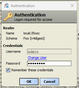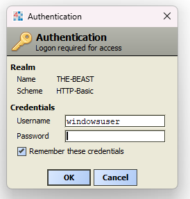 Select ok and the authentication dialogue will appear. Generally speaking when running a platform locally on your PC, the username and password with be your windows username and password.