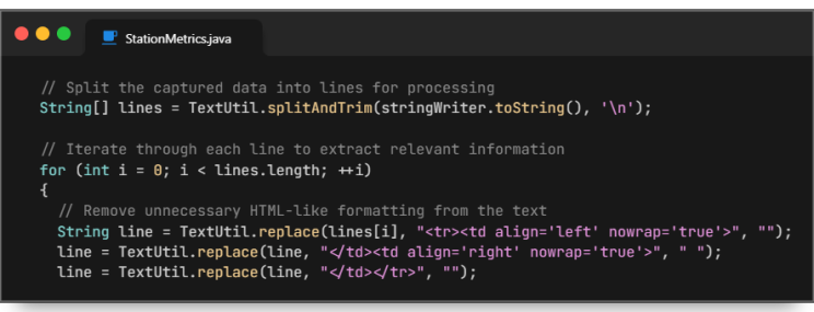 Since we are we can create the spy metrics page into an HTML output, we will need to take some of the structure out of the HTML such as . To do this, we will use the replace method to get rid of that. But how do we parse these lines? We will use an array to parse through the writer and use a for loop to iterate each through each line to extract the relevant information. Then we can remove the unnecessary HTML-like formatting from the text.