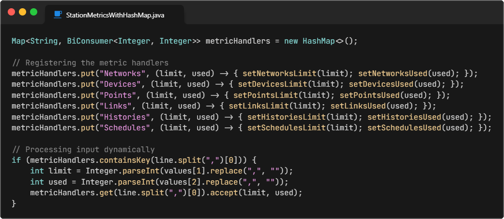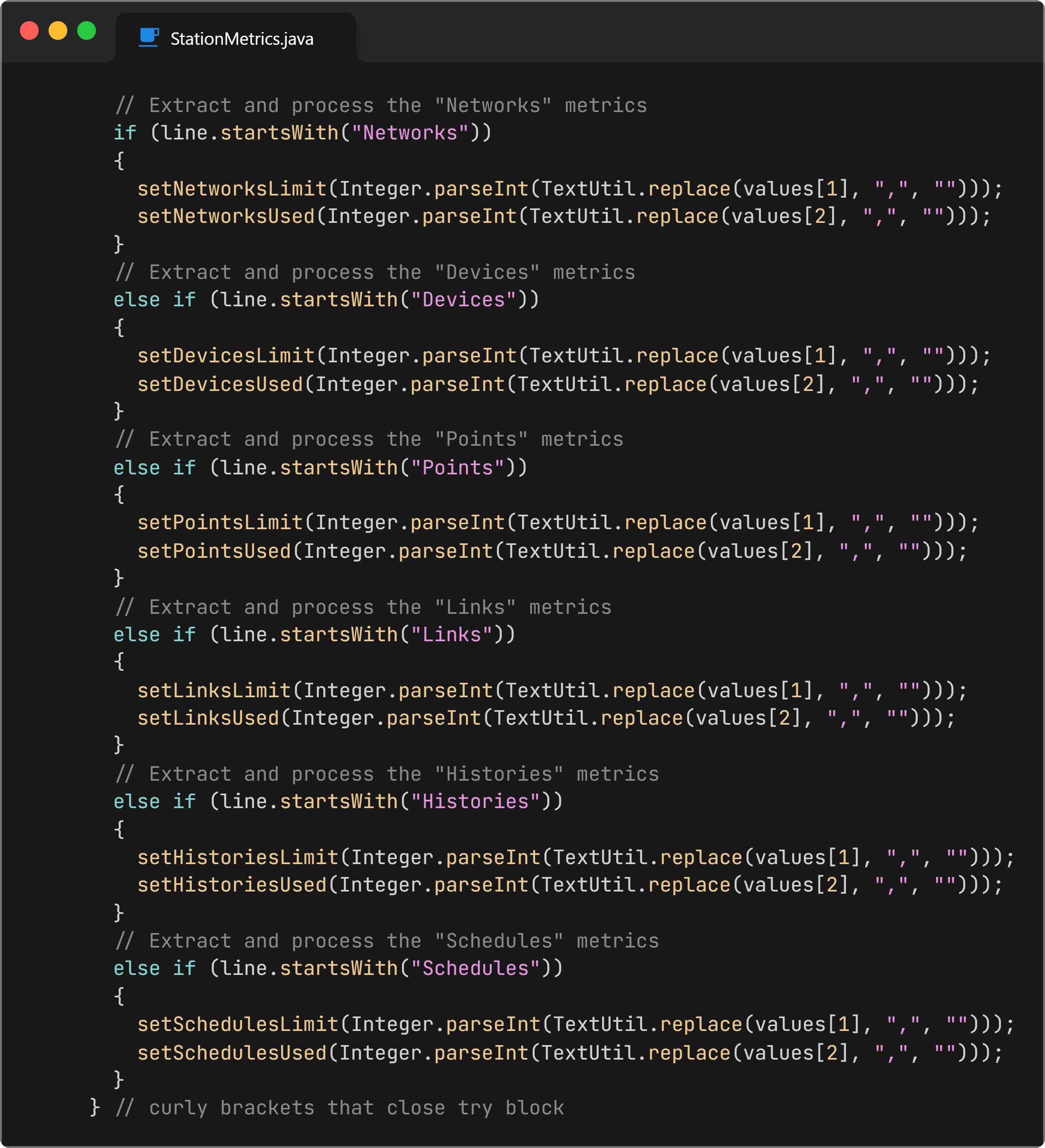 So the logic behind this section of code that contains the strings of Networks, Devices, Points, Links, Histories, and Schedules by checking the type of metric that corresponds to using startsWith(). Then the values are extracted from the gcNumbers[] array. Then we clean out the commas and converting the values of the array to integers. The values are stored in all the setters above.