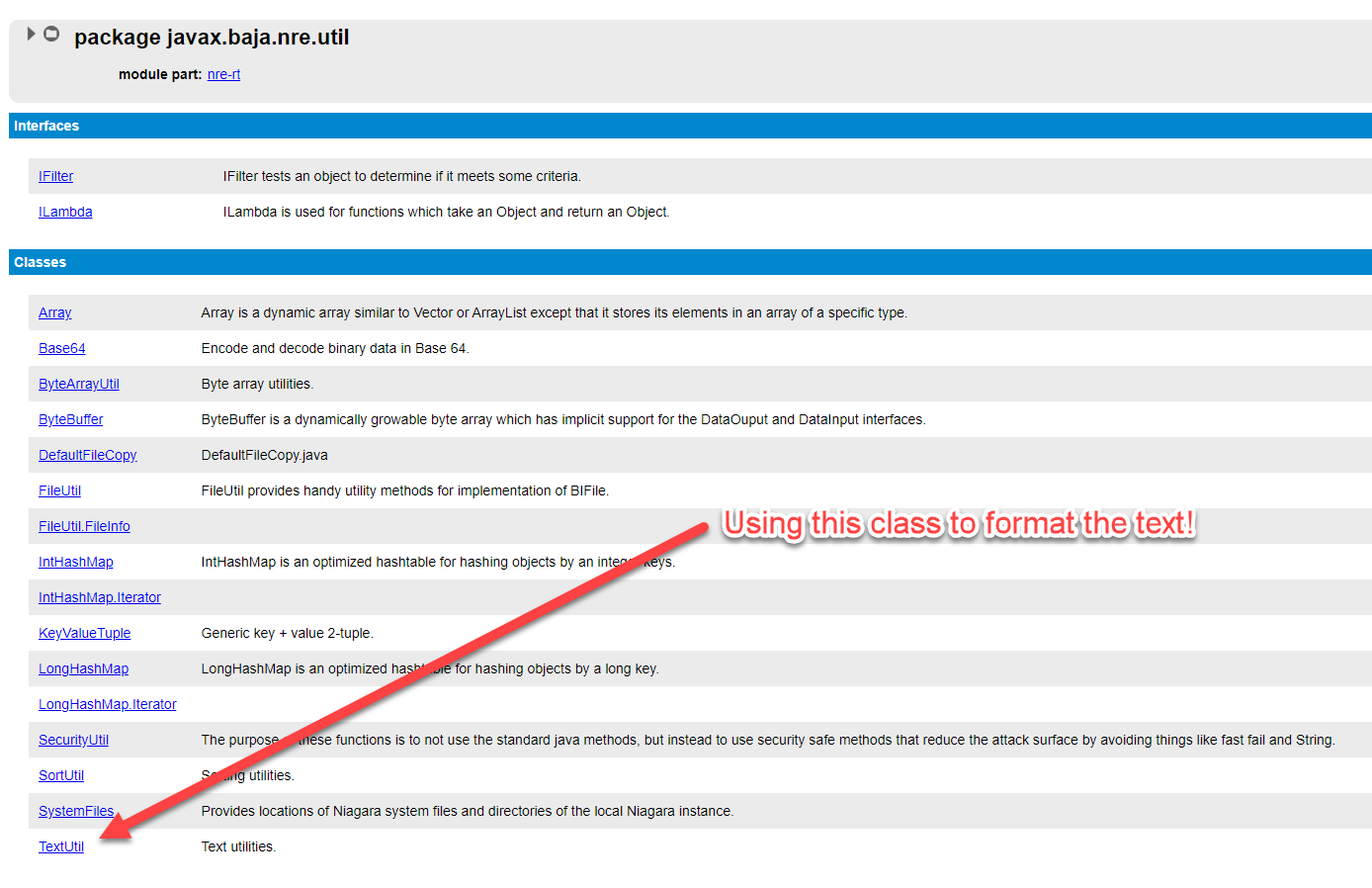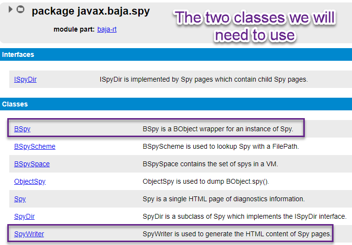 The picture is a little small, but my arrow points to a link to a package called javax.baja.spy (remember this package as well!)