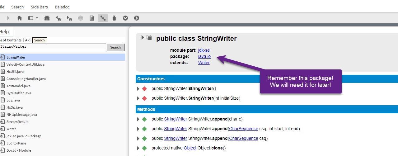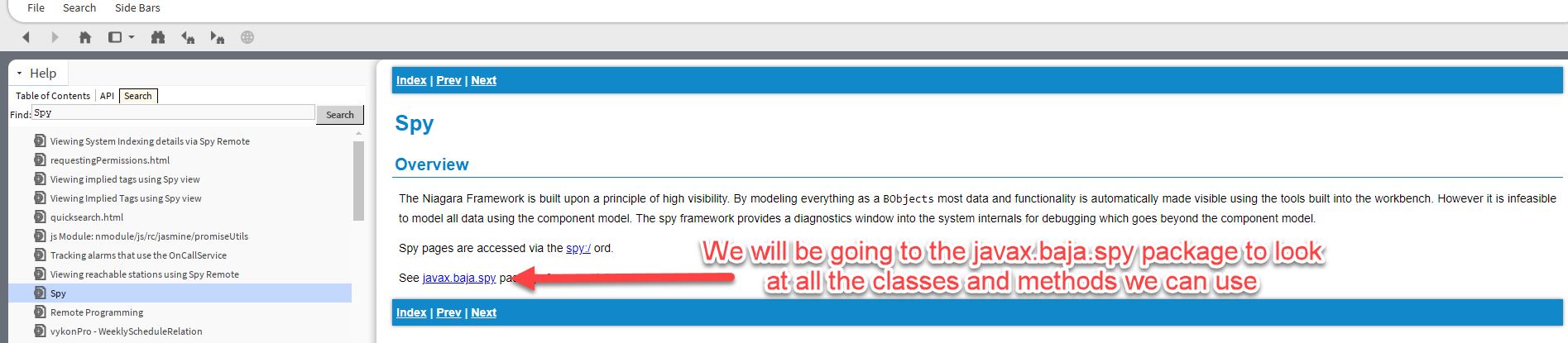 In the help contents if we were to type Spy in the search bar, we will see a many items, from bajadocs to java files and more!