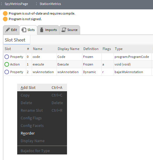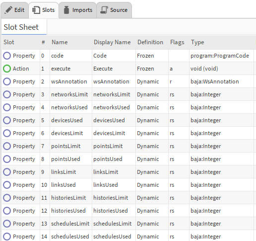 Slots - Slots are properties of the program object. We can add properties that invoke actions, view properties from the wiresheet, and more.