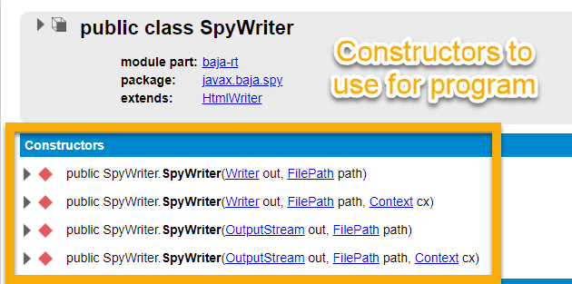 We will be using one of these constructors above to create a new instance of SpyWriter and using the StringWriter as the writer in this case.