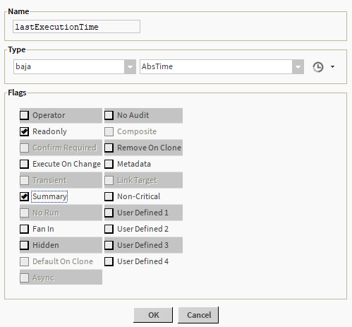Setting the Readonly and Summary flags that not only the property cannot be written to, but the property is viewed on the wiresheet as well.
