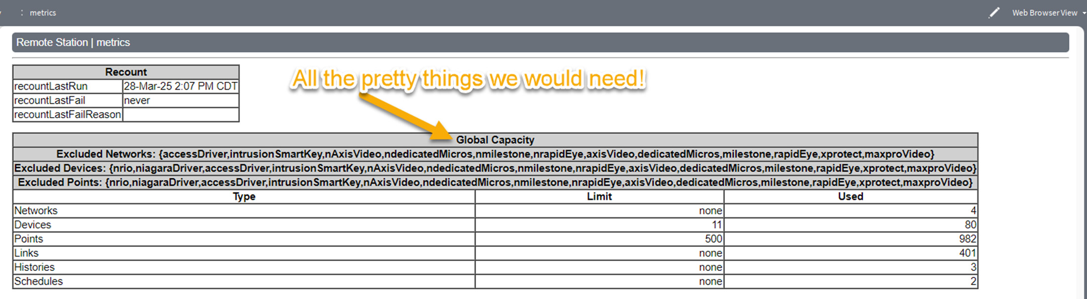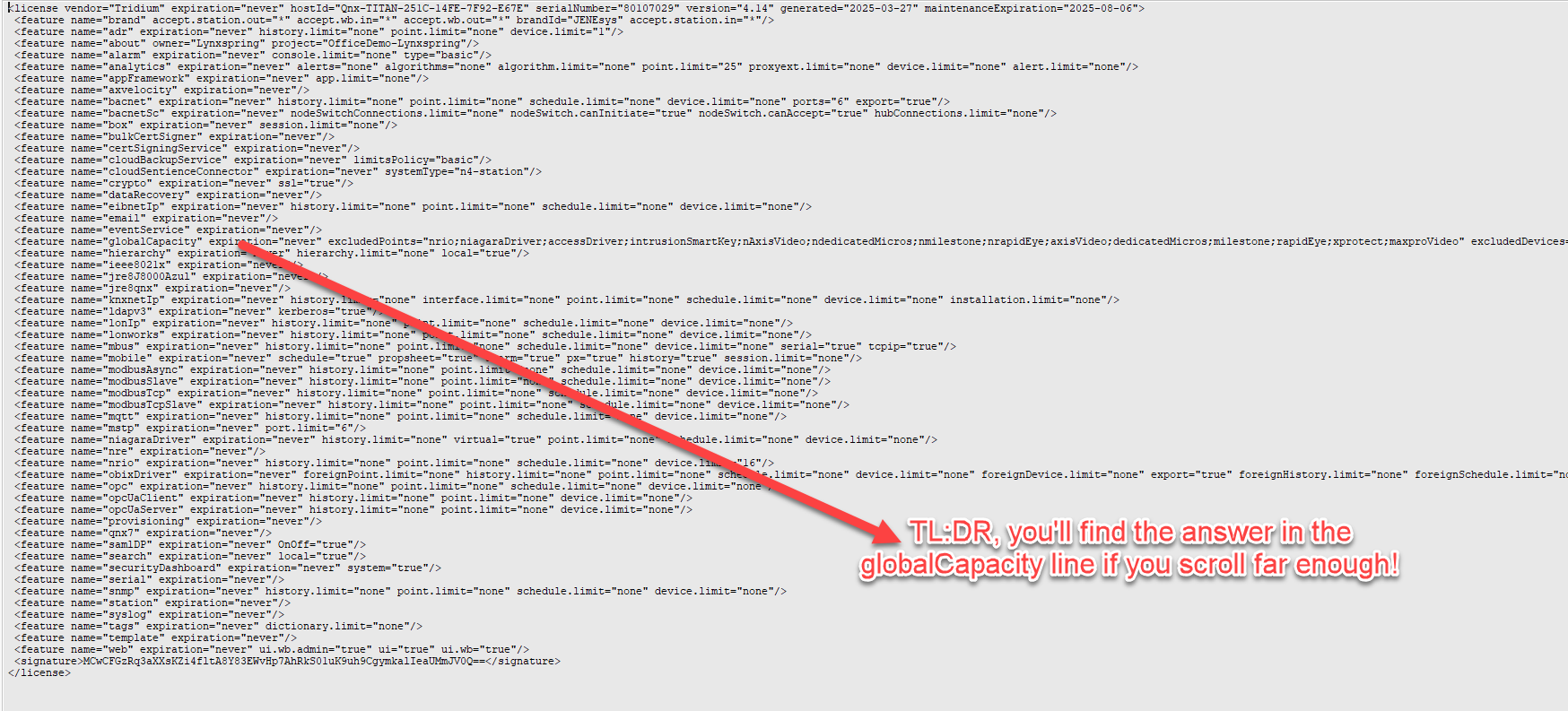 Well… in its current form… nothing! Its information we need to know about. However this is a way to grab this information, its just going to require more typing than anticipated! If there was a way to get this information for all Niagara Controllers (JACEs/Edge Controllers) and put it on the supervisor, we could create a report to figure out when we need a new license!