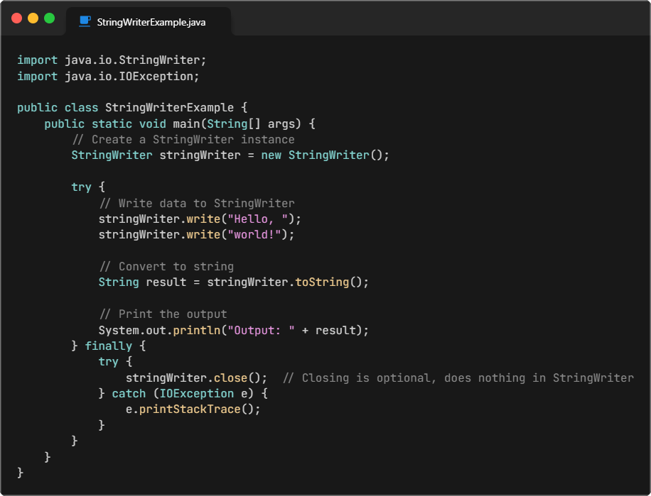 A StringWriter in java is a class from the java.io package (again, we will need that for later) that allows you to write character data into a string buffer, which can then be converted into a String. It acts as a character stream but following a writer interface.