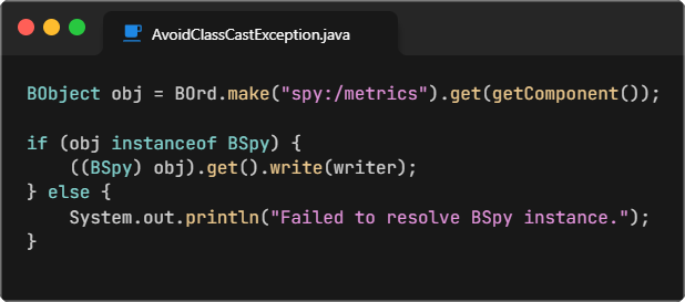 The first two lines of code may make sense to you, but we are making a StringWriter to format the output and using a SpyWriter to retrieve the metrics in an HTML format. However, what about the third line here? Why do we need to cast BSpy onto BOrd? The casting of BSpy from BOrd is required because of how Niagara handles object resolution using BOrd. Heres why: