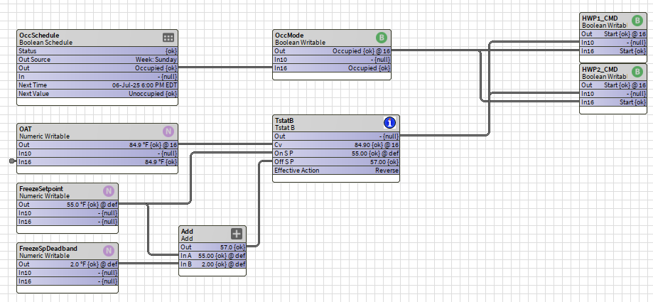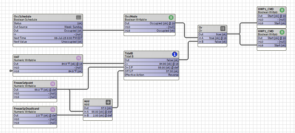 Now let’s add the freeze protection in mind. Again, we could go with logic we practiced in one of the labs here on DDC-Talk, but that’s a lot of effort when we have blocks that will do all of this for us.