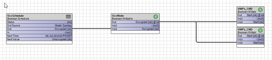 OccSchedule is turned on and off by time of day. I threw an OccMode Boolean in the middle to override the occpuancy of the system (optional, wasn’t a part of the sequence).