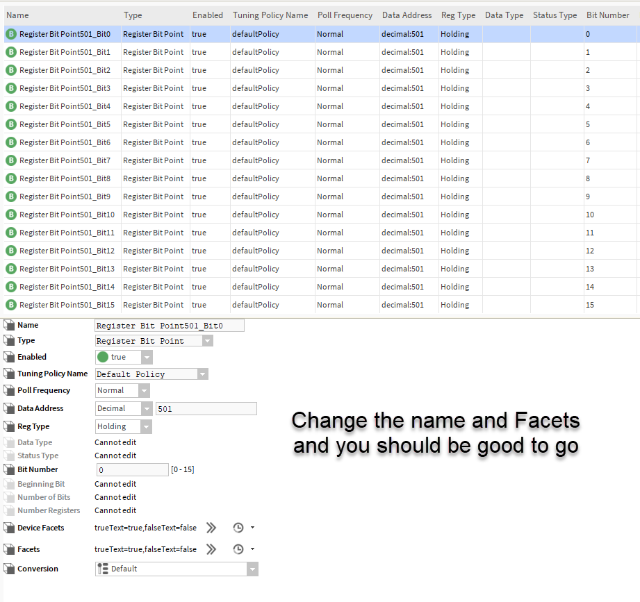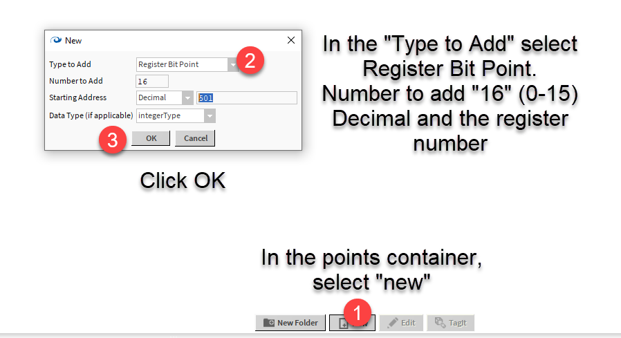 Assuming you already have the device in your ModbusAsyncNetwork, proceed to the points container of that device. Select new and then in the dialog container, change the type to register bit point how many of them you want to add, and the starting address. Once you have selected all that, click OK
