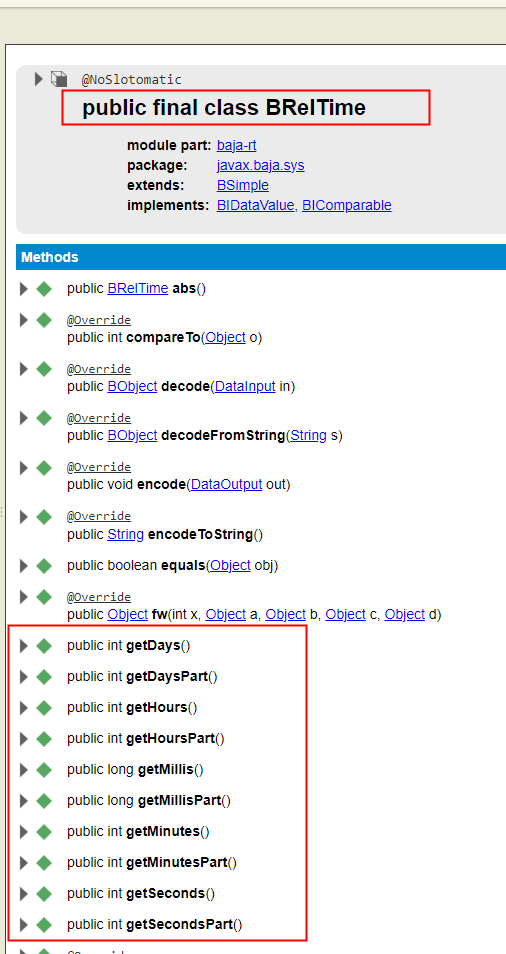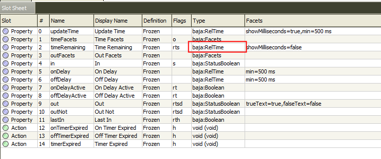 When we look at the slot sheet for the BBooleanDelayWithTimer we can see the slot type for timeRemaining (this is how me know what type to lookup in the baja doc and what methods we can use):