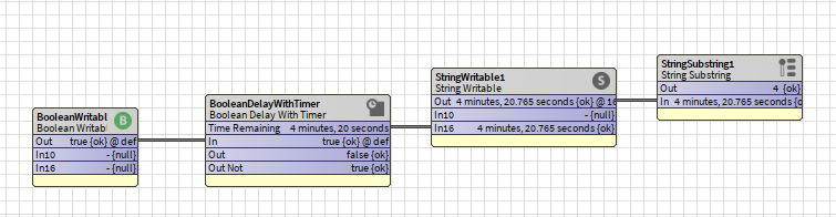 That binding of seconds seems a lot like something I had to do to get a Boolean Delay Block to work. I had to pass the input (min), multiply by 60,000 to get milliseconds, which is the only input the “Off Delay” the Boolean Delay Block would take.